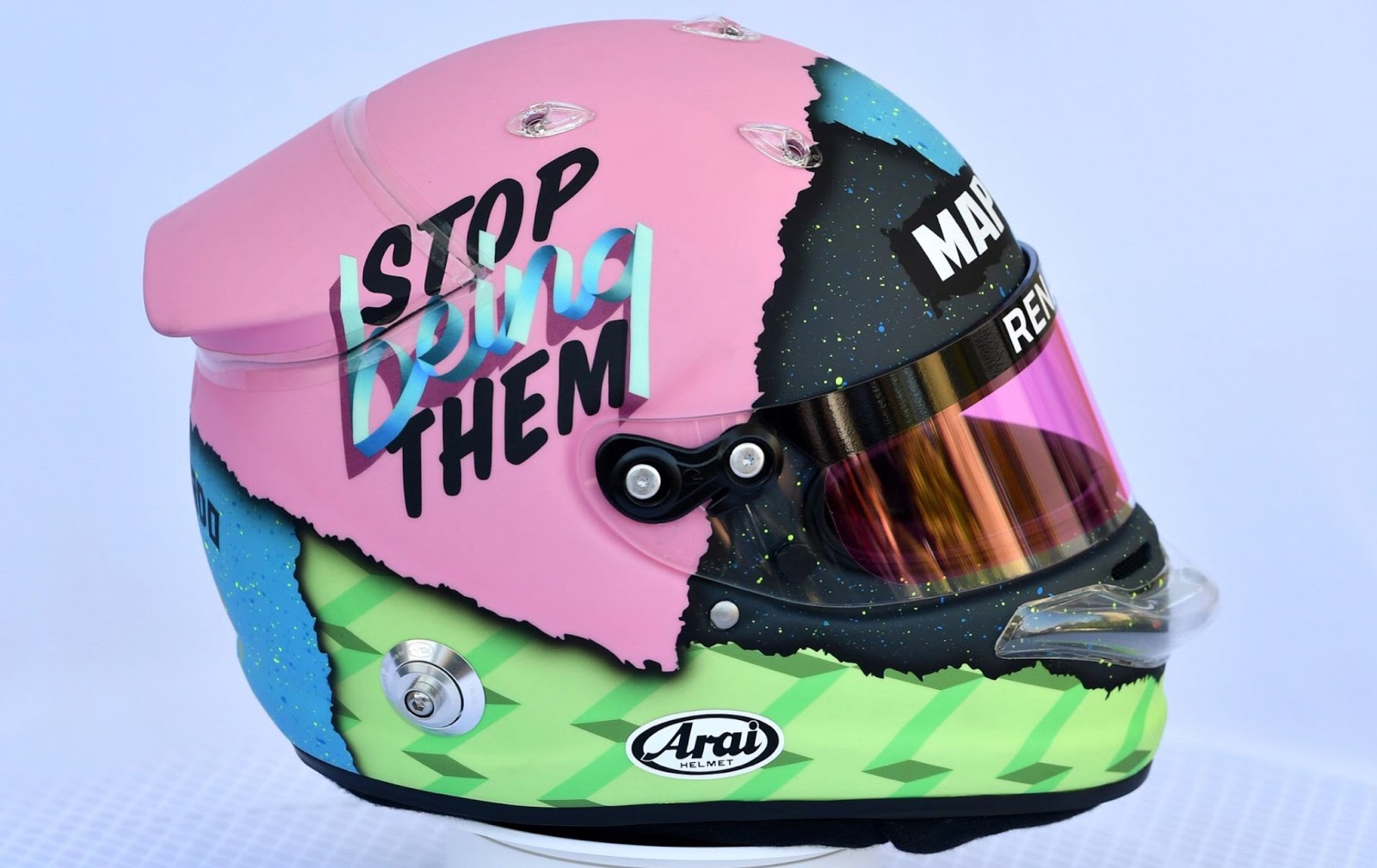 Casco di Daniel Ricciardo. Voto: é la versione sotto acidi di quello di Jacques Villenueve. Come direbbe Bond: “Agitato, non mescolato”.