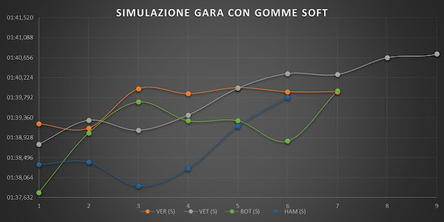 Giusta la scelta fatta da Ferrari, Mercedes e Red Bull nel qualificare i propri piloti durante il Q2 con le gomme medie. Gomme medie che saranno quelle utilizzate allo start nella gara di domani. Come potete osservare dal grafico in basso che mostra i long run effettuati ieri il degrado delle gomme soft era troppo elevato e per i team sarebbe stato impossibile impostare la gara su un singolo stop. Grazie all'utilizzo delle medie nel primo stint i piloti potranno utilizzare il compoud hard per terminare la corsa su singolo stop anche perchè, la gomma dura, nella giornata di ieri ha dimostrato di avere un comportamento ottimo sia a livello di performance che di costanza.