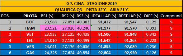 S ci concentriamo ai best sector possiamo notare che, Hamilton, pur avendo ottenuto i migliori intertempi in ciascun settore non è riuscito ad ottenere la pole position. Il pilota inglese è parso, fin da ieri, non completamente a suo agio con la W10 ma è riuscito ugualmente a classificarsi in seconda posizione a pochi millesimi da Bottas. Il suo Ideal lap poteva garantirgli la prima posizione in griglia perchè aveva la possibilità di abbassare il proprio crono di quasi 4 decimi.