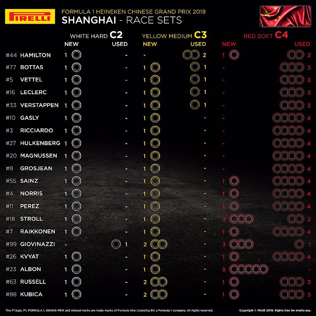 Nella tabella di seguito sono elencati set di gomme nuove e usate che avranno a disposizione i piloti per la gara di domani.