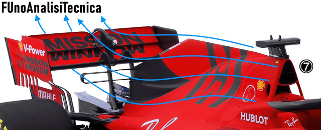 Un concetto di ala anteriore che secondo molti esperti genera meno carico aerodinamico rispetto alle specifiche dei rivali, compensata da una zona dei bargeboard più caricata aerodinamicamente. Questo toglie sicuramente dell'energia preziosa al funzionamento del diffusore (meno si rallenta il flusso nella zona dei bargeboard, quindi meno carico aerodinamico si genera in quella zona, e più downforce sarà possibile generare, idealmente, al posteriore tramite il fondo vettura) ed è per questo che Ferrari ha lavorato molto sull'efficienza del corpo vettura posteriore, andando a rastremare molto la parte alta del cofano motore. Questo per aumentare l'efficienza dell'ala posteriore, elemento molto importante nel progetto 2019 del Team italiano proprio per via del fatto che il fondo è "limitato" da una zona dei bargeboard più caricata aerodinamicamente di quanto visto negli anni passati. In Cina si è provato a scaricare il posteriore, per recuperare ancora più terreno sul dritto, con risultati non positivi.