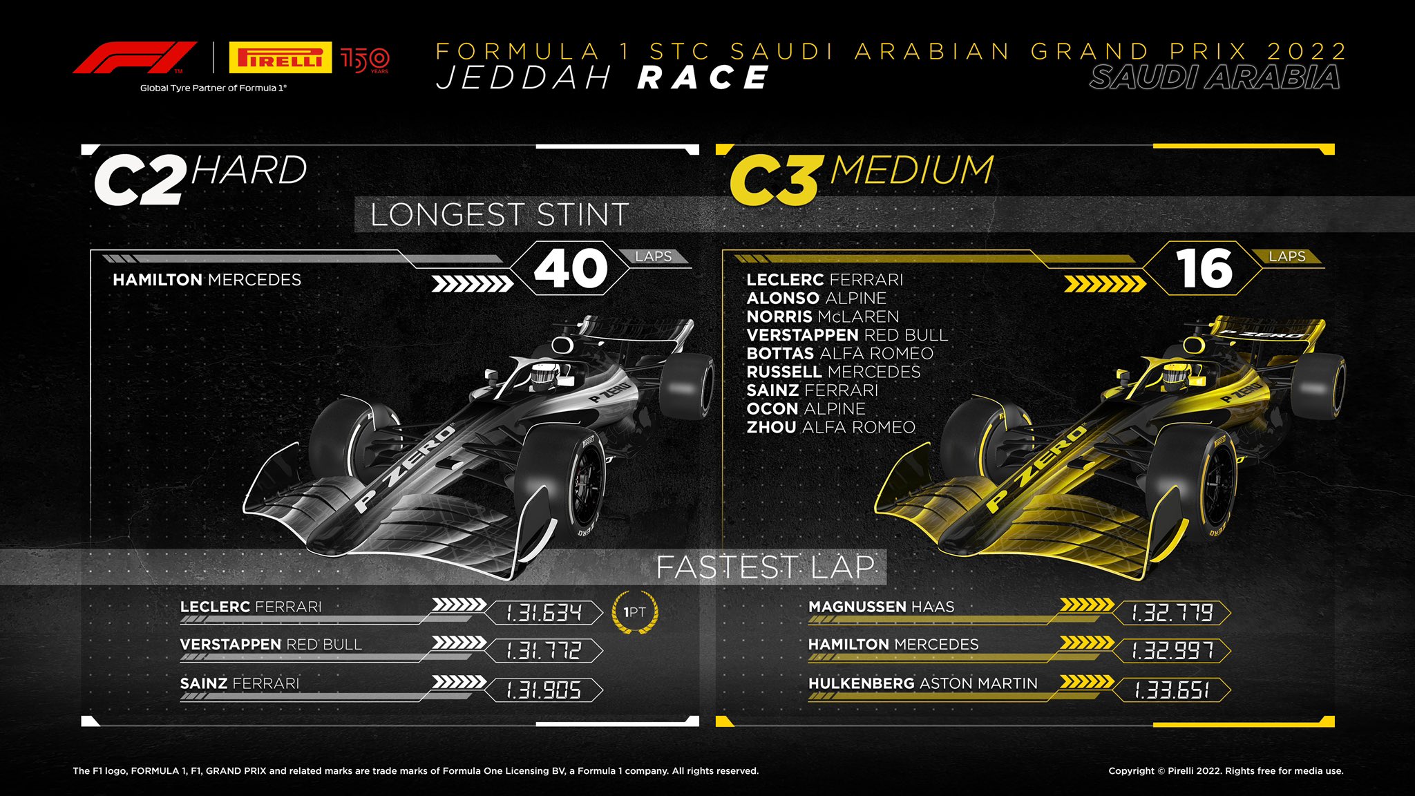 La seconda gara della stagione mostra uno scenario molto diverso rispetto a quanto accaduto nel corso del primo appuntamento. L’andamento ad una sosta riscontrato a Jeddah, è una netta contrapposizione alle 3 soste viste in Bahrain. Le nuove mescole sono decisamente ancora un rebus per i piloti e i team ma, presto, con il passare delle gare riusciranno ad incrementarne la comprensione e miglioreranno indubbiamente anche nella gestione delle stesse.